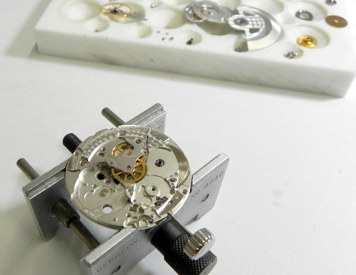 分解写真です。 クロノグラフとなるとさすがに 部品点数が おおくなります。